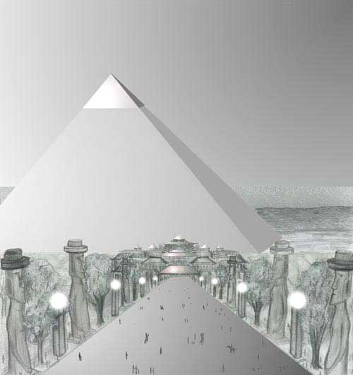The most developed civilization in history of Earth existed on the continent of Mu between ~250,000 and ~14,500 years ago. Illustration shows road to the palace of king of Mu. The statues are 50 meters tall. The pyramid is 440.01 m high.