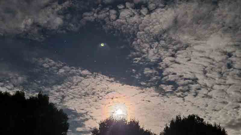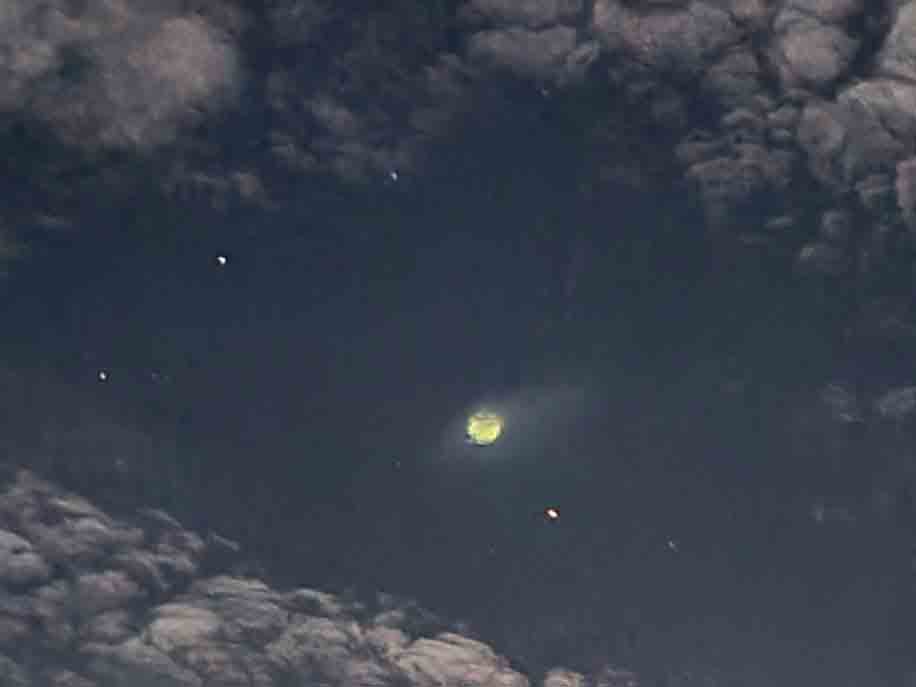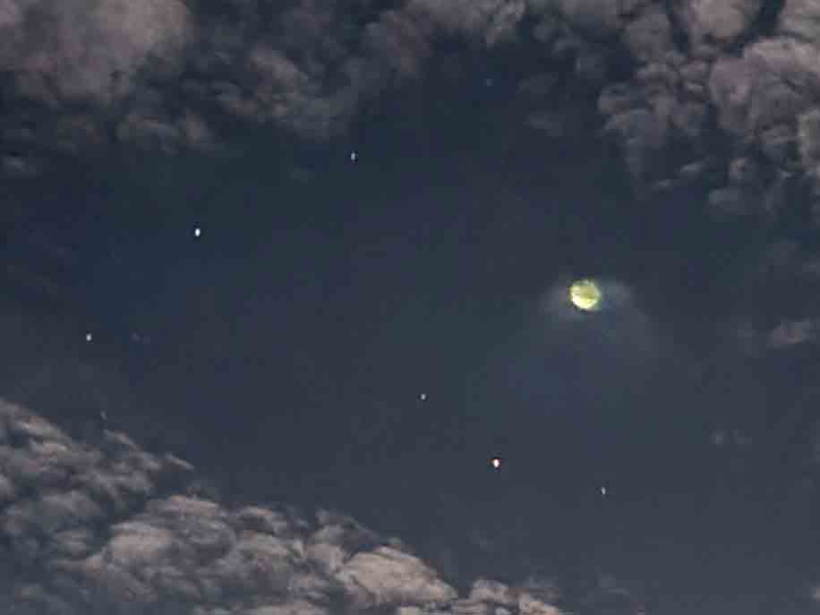 On the 35th anniversary of Michel Desmarquet journey to Thiaoouba, the spacecraft visited Dr Chalko at Mt Best. Its size in the sky was comparable to the full moon, as can be seen in the attached photos. When Dr Chalko took these two photos - the spacecraft was about ~7 km above the remote uninhabited forest. The elliptical halo around the spacecraft is the result of operation of a cyclotron that is involved in propulsion. More details